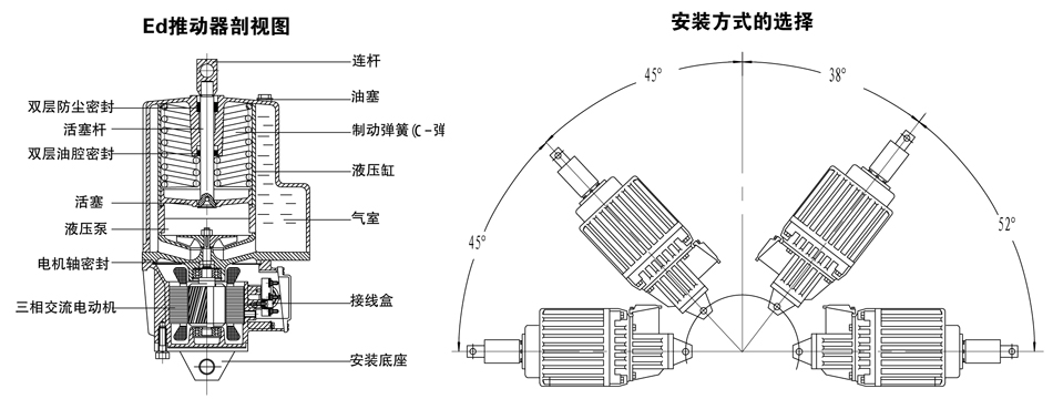 Ed推動(dòng)器油缸殼體一側(cè)設(shè)有平衡氣室,可在0-180。范圍內(nèi)安裝使用。