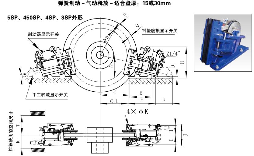 概述:彈簧制動-氣動稽放-適合盤厚: 15或30mm 。SE 、SH 、SP 系列失效保護(hù)盤式制動器與鼓式制動器相比具有結(jié)構(gòu)緊湊,制動力大、安裝方便等優(yōu)點(diǎn),它主要用于起重、運(yùn)輸、冶金、礦山、港口、建筑機(jī)械、電纜、吊索設(shè)備、風(fēng)力發(fā)電機(jī)、紡織機(jī)械等各行業(yè)的多種機(jī)械驅(qū)動配套的機(jī)械制動或減速。