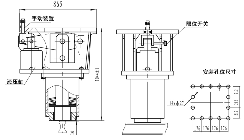 主要設(shè)計(jì)特點(diǎn): 常閉式設(shè)計(jì)、采用液壓站集中驅(qū)動(dòng)控制以特制碟形彈簧實(shí)現(xiàn)頂軌制動(dòng); 摩擦塊采用先進(jìn)的高耐磨鋼,性能可靠; 設(shè)有限位開關(guān),顯示工作狀態(tài); 帶手動(dòng)釋放,安裝維護(hù)方便。